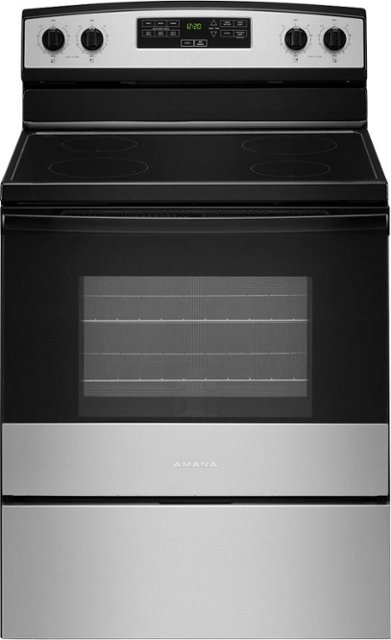 Loading... Please wait...Cook delicious family meals with this Amana electric range. The stainless steel construction provides a high-end finish, and an extra-large viewing window lets you keep an eye on cakes and muffins without altering the inside temperature. This Amana electric range includes a storage drawer for easy access to cookie sheets and baking pans.