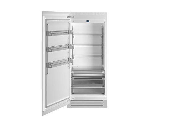 These premium built-in column refrigerators are masterpieces of Bertazzoni design and technology. Their stylish stainless-steel front doors reflect close attention to detail and high-quality materials, inside and out. Aluminium and glass surfaces make it easier to maintain hygiene throughout. The side-mounted evaporator design offers category-leading depth and storage capacity. Top and lateral LED lighting gives you perfect all-round visibility. It is easy to use, the touch-control user interface offers precision temperature control to extend food preservation. A variable speed compressor ensures accurate temperature control and energy efficiency. Efficiency is key: lateral airflow creates a cold air curtain to maintain a consistent temperature even when the door is opened frequently. Rapid cooling to optimize the temperature when large amounts of food are loaded. Proprietary lift & swing hinges allow for flush installation with minimal clearance from surrounding cabinet panels. This allows for elegant configurations of refrigerator, freezer and wine cellar in any desired width. All three columns work in harmony with handles and finishes available for every Series.