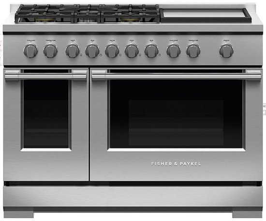 With Professional styling, this large range has five burners delivering powerful high heat, a griddle and two gas ovens. This range has craftsmanship in every detail, with real stainless steel, cast-iron trivets, and titanium coated dials. Each cavity features incandescent lights and full extension telescopic racks.