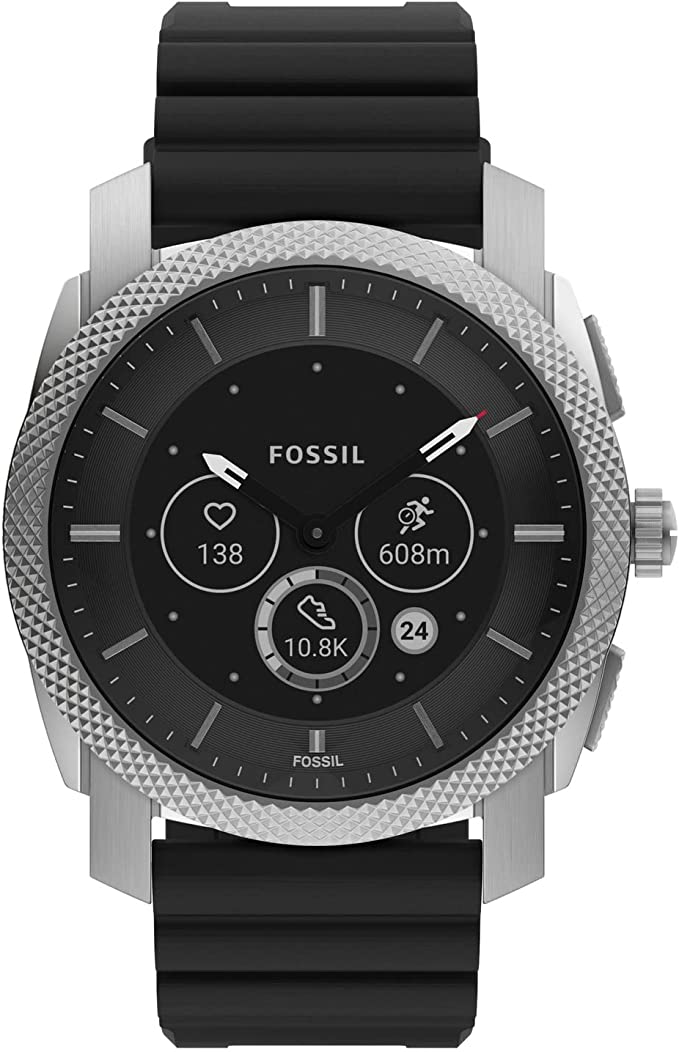 This 45mm Machine Gen 6 Hybrid smartwatch gives you 2+ weeks battery life and features a black silicone strap plus an always-on readout display so you can get your heart rate, message previews, weather and more at a glance. The Fossil Smartwatches App is provided by Fossil Group, Inc. so your data will be stored in the USA. See the Fossil Smartwatches App Privacy Policy and Terms of Use for more (accessible below at “Customer Care”). Battery life is dependent on usage. Fossil smartwatches work with phones running the latest version of Android or iOS. Supported features may vary between countries with compatibility subject to change.