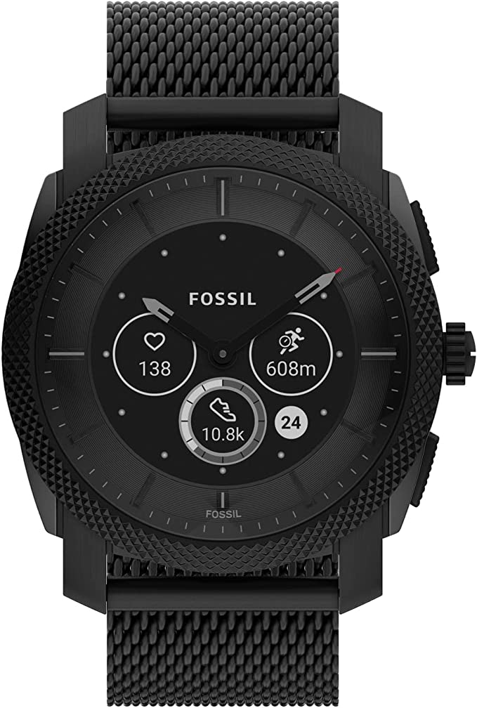 This 45mm Machine Gen 6 Hybrid smartwatch gives you 2+ weeks battery life and features a black stainless steel bracelet plus an always-on readout display so you can get your heart rate, message previews, weather and more at a glance. The Fossil Smartwatches App is provided by Fossil Group, Inc. so your data will be stored in the USA. See the Fossil Smartwatches App Privacy Policy and Terms of Use for more (accessible below at “Customer Care”). Battery life is dependent on usage. Fossil smartwatches work with phones running the latest version of Android or iOS. Supported features may vary between countries with compatibility subject to change.