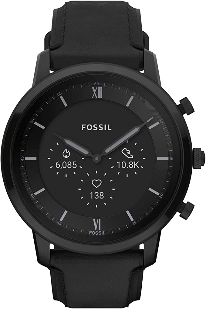 This 44mm Neutra Gen 6 Hybrid smartwatch gives you 2+ weeks battery life and features a black leather strap plus an always-on readout display so you can get your heart rate, message previews, weather and more at a glance. The Fossil Smartwatches App is provided by Fossil Group, Inc. so your data will be stored in the USA. See the Fossil Smartwatches App Privacy Policy and Terms of Use for more (accessible below at “Customer Care”). Battery life is dependent on usage. Fossil smartwatches work with phones running the latest version of Android or iOS. Supported features may vary between countries with compatibility subject to change.