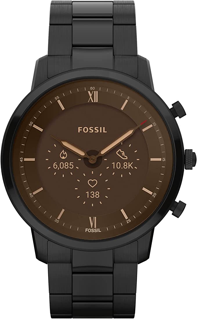 This 44mm Neutra Gen 6 Hybrid smartwatch gives you 2+ weeks battery life and features a black stainless steel bracelet plus an always-on readout display so you can get your heart rate, message previews, weather and more at a glance. The Fossil Smartwatches App is provided by Fossil Group, Inc. so your data will be stored in the USA. See the Fossil Smartwatches App Privacy Policy and Terms of Use for more (accessible below at “Customer Care”). Battery life is dependent on usage. Fossil smartwatches work with phones running the latest version of Android or iOS. Supported features may vary between countries with compatibility subject to change.