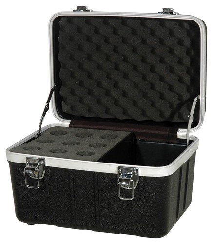 Rugged transportation case houses up to 9 microphones, so you can transport them to gigs. Cable storage compartment measures 8"H x 5"W x 8.75"D.