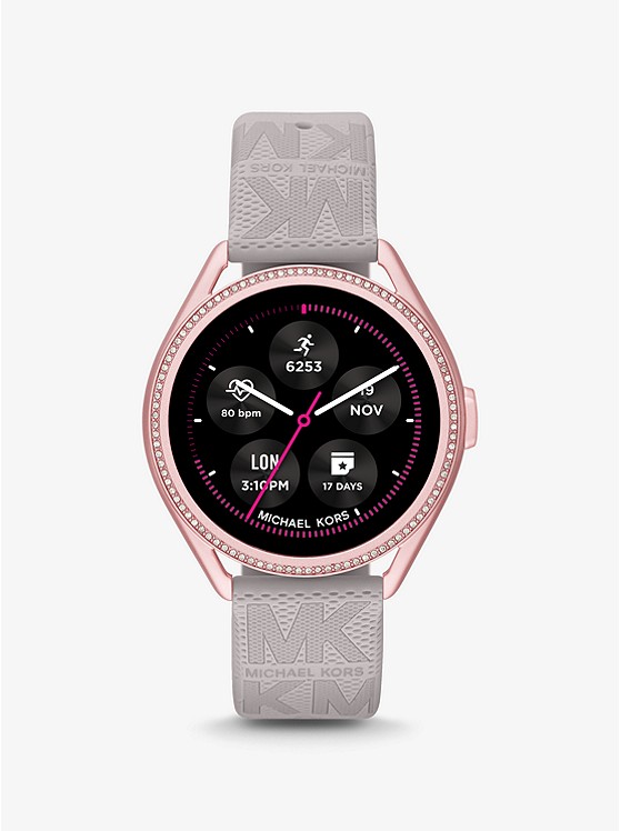 Michael Kors' 43mm Gen 5E MKGO Smartwatch offers a glamorous and sporty look in a logo-detailed gray silicone strap, pavé, pale pink aluminum topring and the latest Wear OS by Google technology. Smartwatches powered with Wear OS by Google are compatible with iPhone® and Android™ phones. Wear OS by Google and other related marks are trademarks of Google LLC. Wear OS by Google works with phones running Android 6.0+ (excluding Go edition) and iOS 12.0+. Supported features may vary across platforms and countries.