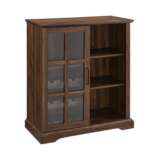 Loading... Please wait...Provide a functional storage option with this Walker Edison 36-inch bar cabinet. The tempered sliding glass door lets you determine which half stays closed or open, while the rectangular top accommodates decorative items. This dark walnut Walker Edison 36-inch bar cabinet has fixed and adjustable shelves for storing glasses and wine bottles.